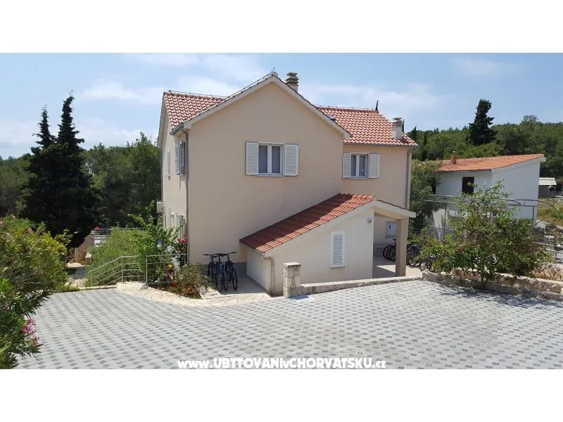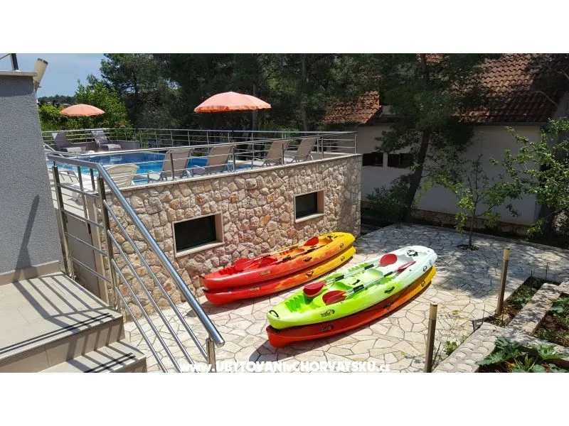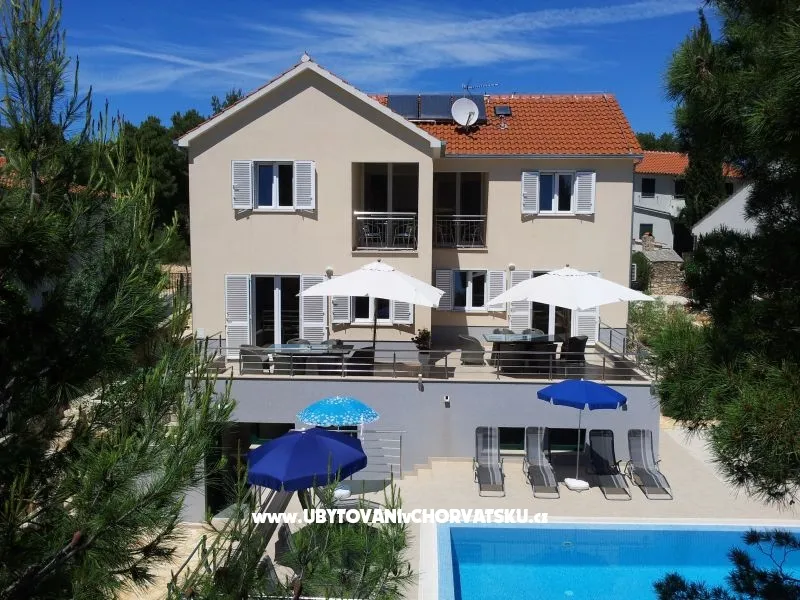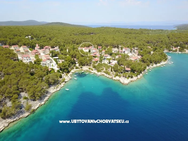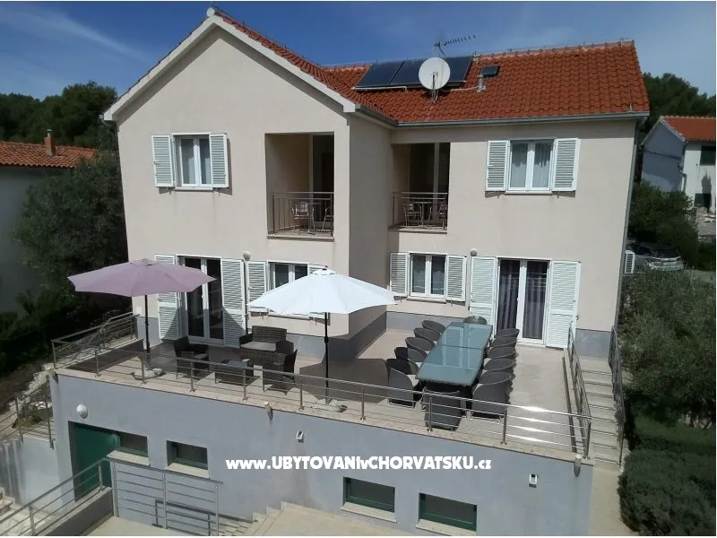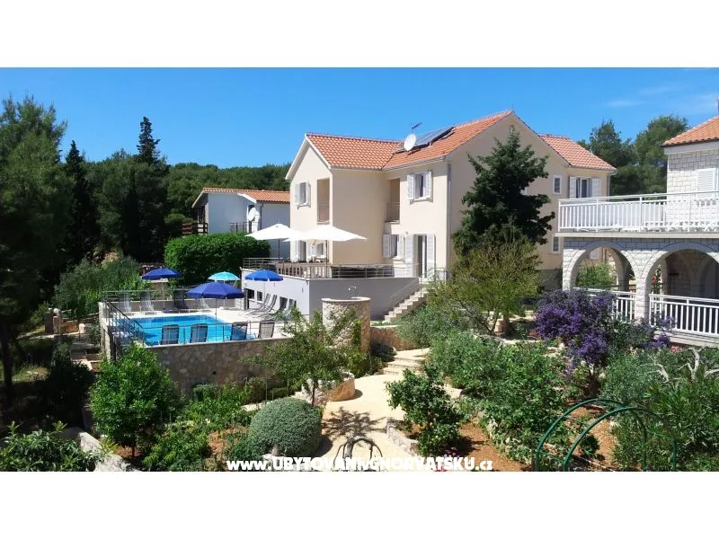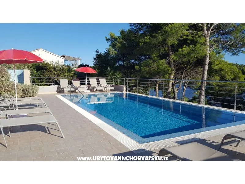 The detached holiday villa has a heated private pool and is located in the quiet and crystal-clear Osibova Bay, just 30 m from a small pebble beach. The house includes 4 kayaks and 8 bicycles. In the town of Milna, 2 km away, you'll find everything you need. On the way there, you'll find public sports fields (tennis, football, basketball and beach volleyball) that can be used. The modernly equipped villa consists of two identical residential units. In total, it features 6 bedrooms, 7 bathrooms, 2 living rooms with integrated kitchens, and a large shared sun terrace. In the basement, you'll find a 130 m2 recreation room with games and fitness equipment, including billiards, table tennis and foosball. Facilities include Wi-Fi, private parking and a garden with a barbecue. The house is fully air-conditioned (each room with individually controllable air conditioning).